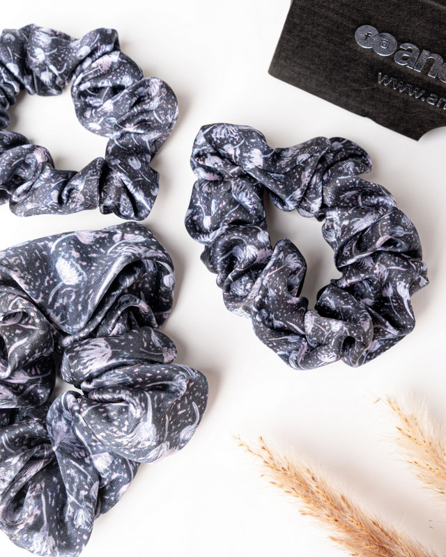 The Rožu Līcis set includes: Rožu Līcis 5 cm  Large, Rožu Līcis 3.5 cm Medium, Rožu Līcis 2.5 cm  Small  silk hair scrunchies with Anda Abstract designs